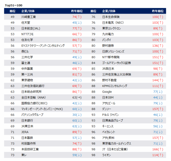 今回の調査では、三井不動産(10位→6位)、三菱地所(9位→8位)といった不動産デベロッパー、日本郵船(30位→21位)、商船三井(51位→23位)といった海運などの分野が大きく順位を伸ばしました。