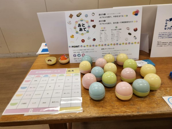 何が入っているか中身を当てるクイズと、同じ音がするものを当てる神経衰弱の2通りの遊び方を提案。