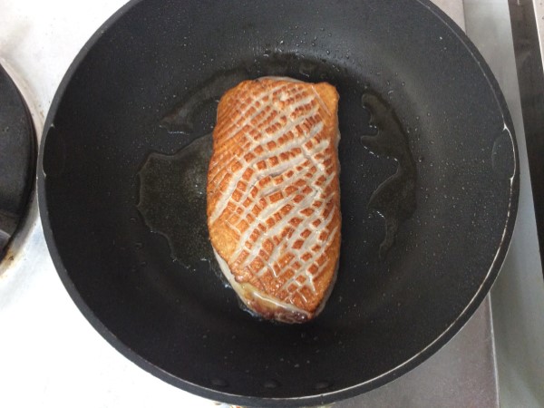 4.フライパンを火にかけ、熱くなったら皮目から合鴨肉を入れ中火で焼きます。