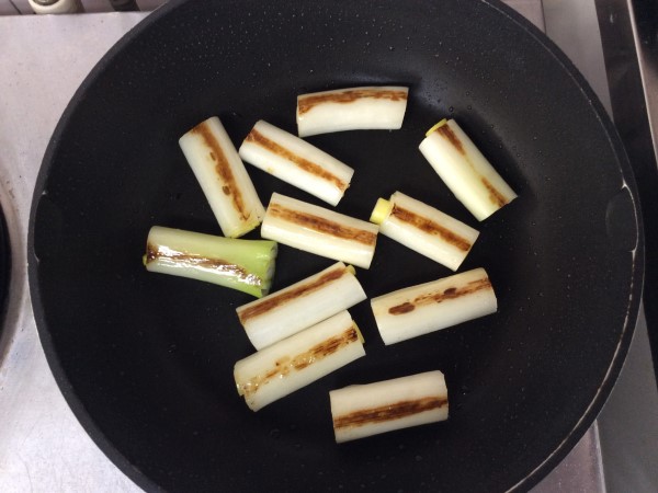 7.フライパンの油を捨て、長ねぎを入れて火にかけ、長ねぎにも美味しそうな焼き色を付けます。