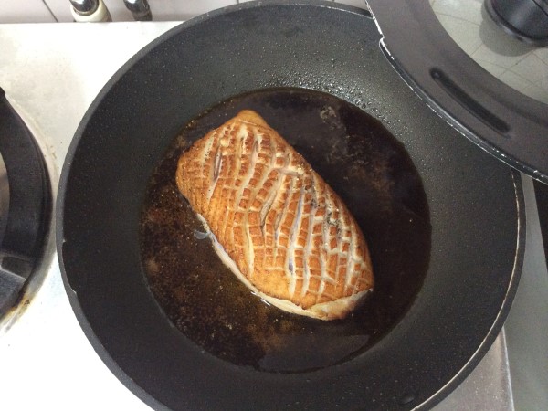 5.皮目に美味しそうな色がついたらひっくり返し、身の方にも焼き色を付けます。