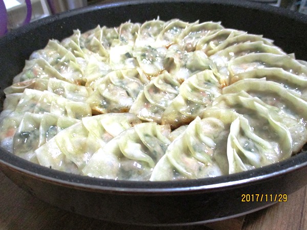 - 焼き色が付いたら水(餃子の半分が隠れるくらい)入れ、蓋をする。