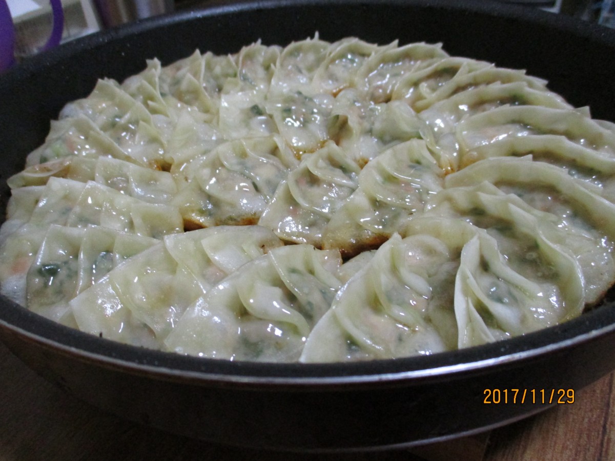 - 焼き色が付いたら水(餃子の半分が隠れるくらい)入れ、蓋をする。