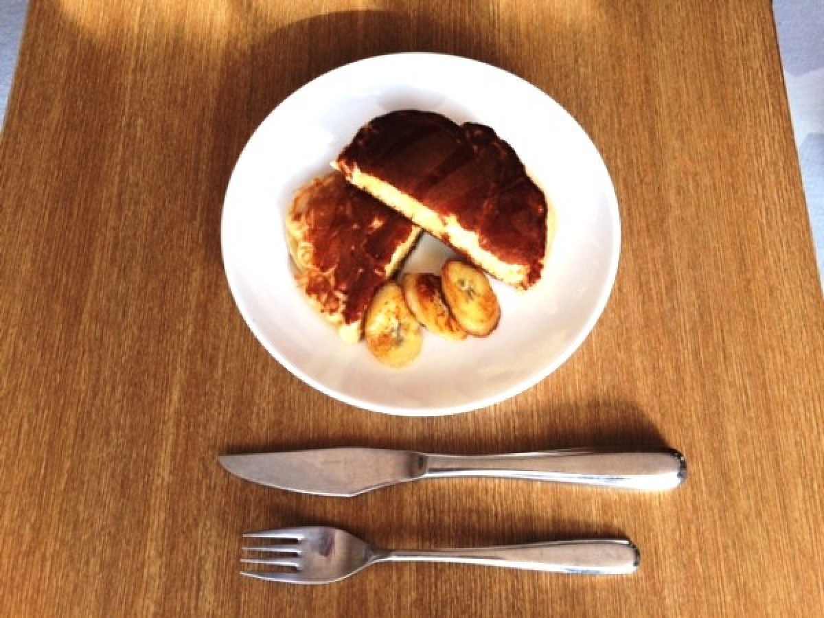 - 火に戻して生地を入れ両面焼き、焼き終わったらフライパンにバター入れとけたら残りのバナナを入れ焼く