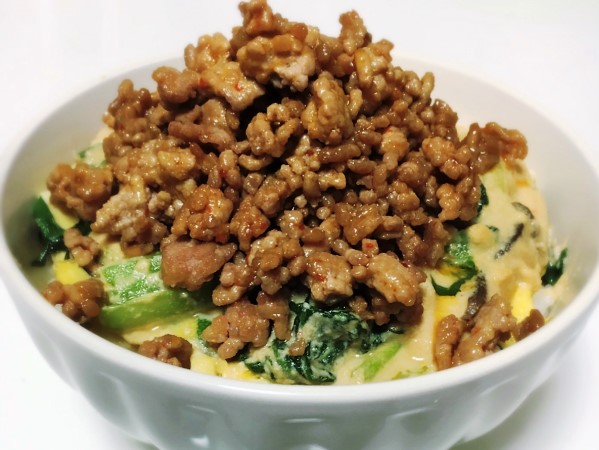 もう一度弱火で加熱し、とろみが出るまで煮詰める。 - 卵をのせたごはんの上に⑤をかけて中央にひき肉を盛り完成。
