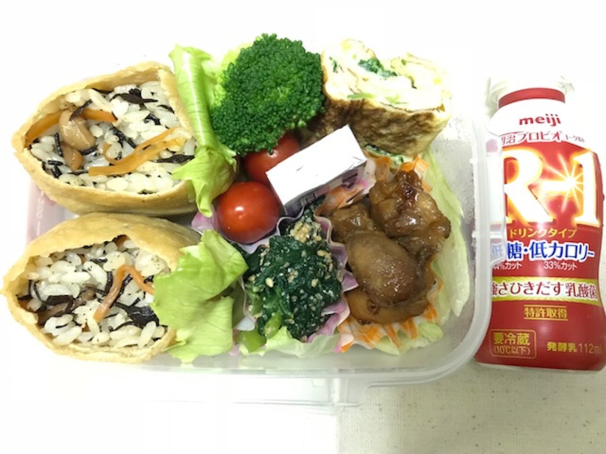 練習終わりでも食べやすいように、副菜のひじきの煮物を稲荷に入れました。