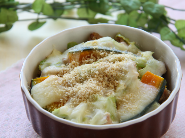 4.2からかぼちゃを半量取り出しておき、残ったかぼちゃの上に3を重ねて、その上に残りのかぼちゃとチーズをのせ、電子レンジで3分間加熱する。