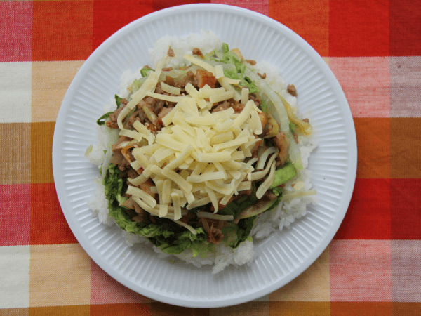 5.皿にごはん・白菜・④の順に盛り、ミックスチーズとごまをのせる。