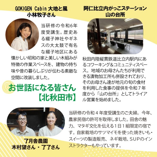 研修は、10月26日(日)のオンライン講義での座学に加え、11月7日~9日の現地研修(北秋田市・仙北市)で、実際に農家民宿に宿泊し、現役オーナーや先輩起業者と交流する機会が用意されています。