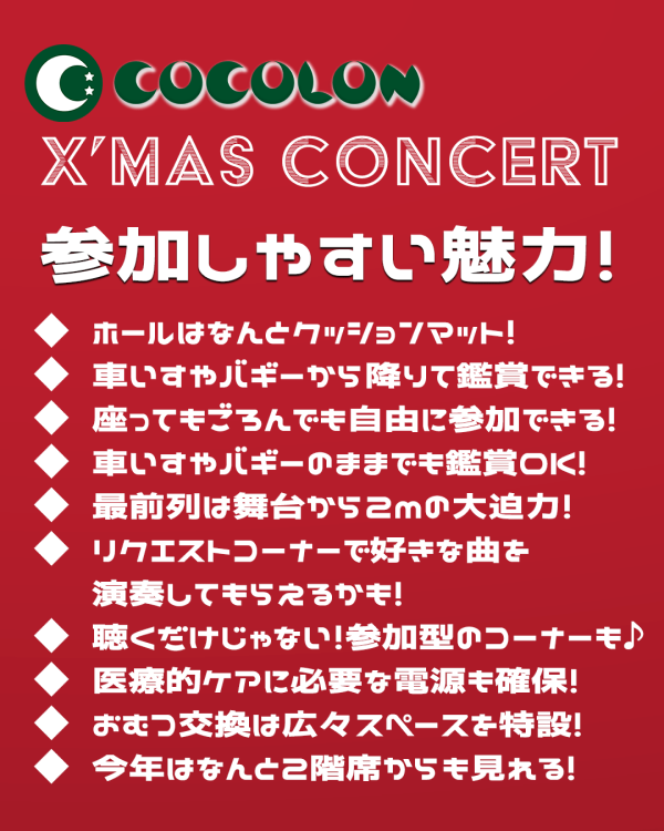 重症心身障がい児や医療的ケア児、そのきょうだいと家族が安心して音楽を楽しめる「COCOLONクリスマスコンサート2025」が、12月20日(土)、東京ウィメンズプラザ(渋谷区)で開催されます。