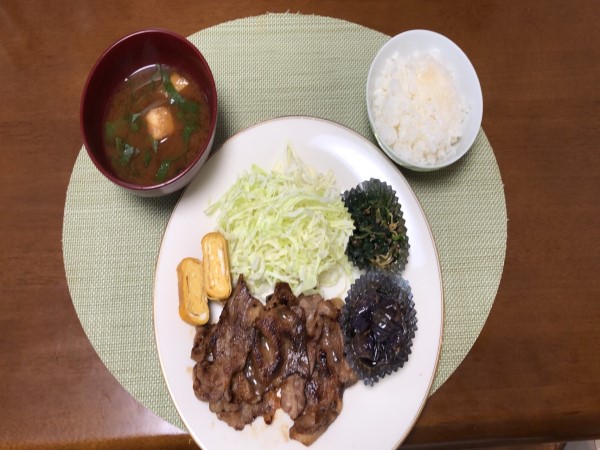 この日のメニューは、肉炒め、白米、玉ねぎ・ワカメ・麩・シソの葉を入りの具沢山味噌汁。