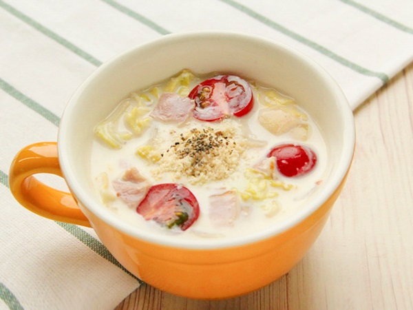 味付けがとても簡単で、メインが豆乳と塩麹、お好みで粉チーズと粗挽き胡椒をかければスープの味付けが完成します。