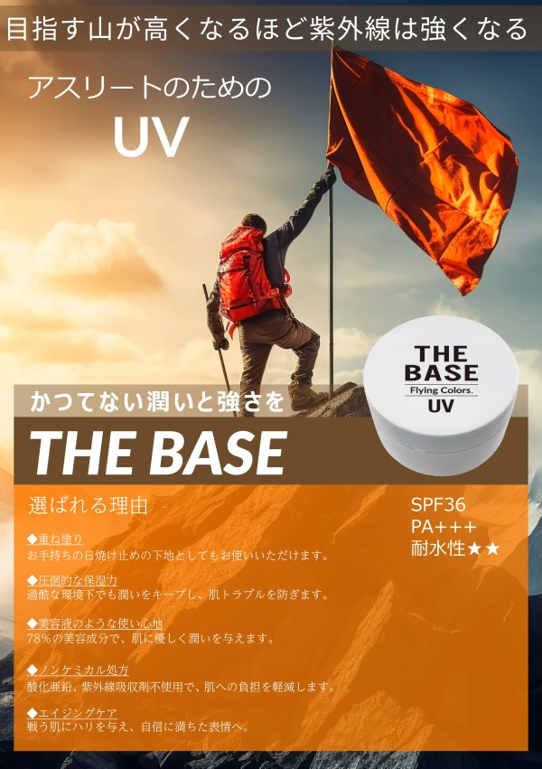有限会社フライングカラーズが開発した 「アスリートのための日焼け止め THE BASE」 は、過酷な環境下で戦う肌を守り抜くためにつくられた、まさに“全天候型UV”。