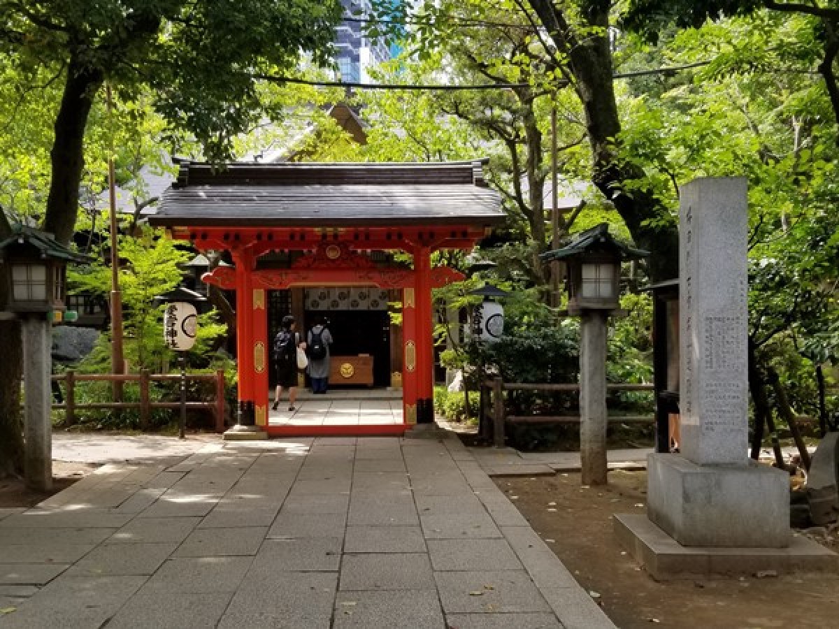 日比谷線の神谷町からオフィス街を抜けていくと、こんもりと緑に覆われた閑静な一角があり、神社の鳥居が見えてきます。