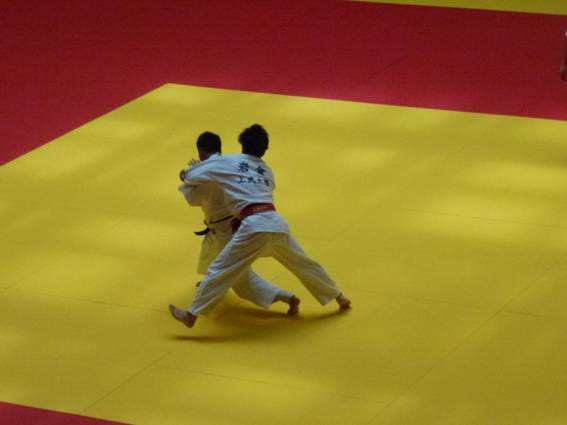 赤と黄色の場内では、選手の白い道着がよく映える。